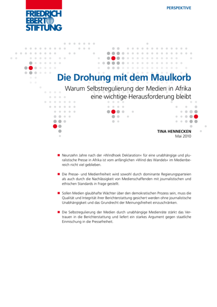"Neunzehn Jahre nach der »Windhoek Deklaration« für eine unabhängige und pluralistische Presse in Afrika ist vom anfänglichen »Wind des Wandels« im Medienbereich nicht viel geblieben. Die Presse- und Medienfreiheit wird sowohl durch dominante Regierungsparteien als auch durch die Nachlässigkeit von Medienschaffenden mit journalistischen und ethischen Standards in Frage gestellt. Sollen Medien glaubhafte Wächter über den demokratischen Prozess sein, muss die Qualität und Integrität ihrer Berichterstattung gesichert werden ohne journalistische Unabhängigkeit und das Grundrecht der Meinungsfreiheit einzuschränken. Die Selbstregulierung der Medien durch unabhängige Medienräte stärkt das Vertrauen in die Berichterstattung und liefert ein starkes Argument gegen staatliche Einmischung in die Pressefreiheit." (Seite 1)