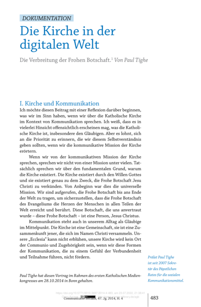 "Prälat Paul Tighe ist seit 2007 Sekretär des Päpstlichen Rates für die sozialen Kommunikationsmittel. Paul Tighe hat diesen Vortrag im Rahmen des ersten Katholischen Medienkongresses am 28.10.2014 in Bonn gehalten." (Seite 483)