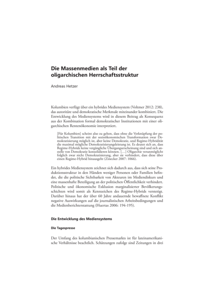 "Kolumbien verfügt über ein hybrides Mediensystem (Voltmer 2012: 238), das autoritäre und demokratische Merkmale miteinander kombiniert. Die Entwicklung des Mediensystems wird in diesem Beitrag als Konsequenz aus der Kombination formal demokratischer Institutionen mit einer oligarchischen Rentenökonomie interpretiert." (Seite 541)