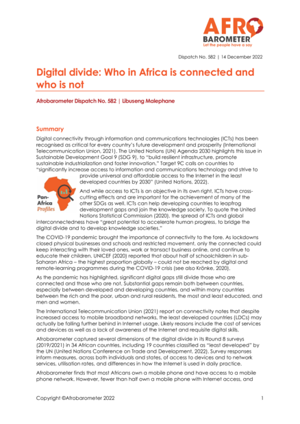 "Afrobarometer finds that most Africans own a mobile phone and have access to a mobile phone network. However, fewer than half own a mobile phone with Internet access, and even fewer have access to a computer. This translates to low levels of Internet use in many countries. Lack of Internet access and use is far more common among women and people who are rural, older, less wealthy, and/or less educated. There is also a sizeable gap between LDCs and more developed countries." (Summary, page 1-2)