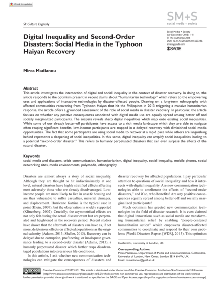 "This article investigates the intersection of digital and social inequality in the context of disaster recovery. In doing so, the article responds to the optimism present in recent claims about “humanitarian technology” which refers to the empowering uses and applications of interactive technologies by disaster-affected people. Drawing on a long-term ethnography with affected communities recovering from Typhoon Haiyan that hit the Philippines in 2013 triggering a massive humanitarian response, the article offers a grounded assessment of the role of social media in disaster recovery. In particular, the article focuses on whether any positive consequences associated with digital media use are equally spread among better off and socially marginalized participants. The analysis reveals sharp digital inequalities which map onto existing social inequalities. While some of our already better-off participants have access to a rich media landscape which they are able to navigate often reaping significant benefits, low-income participants are trapped in a delayed recovery with diminished social media opportunities. The fact that some participants are using social media to recover at a rapid pace while others are languishing behind represents a deepening of social inequalities. In this sense, digital inequality can amplify social inequalities leading to a potential “second-order disaster.” This refers to humanly perpetuated disasters that can even surpass the effects of the natural disaster." (Abstract)