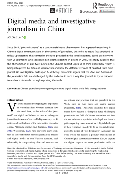 "Since 2014, “plot twist news” as a controversial news phenomenon has appeared extensively in Chinese digital communication. In the context of journalism, this refers to news facts provided in follow-up reporting that contradict the facts provided in the initial reporting. Based on interviews with 25 journalists who specialize in in-depth reporting in Beijing in 2017, this study suggests that the phenomenon of plot twist news in the Chinese context urges us to think about how “truth” is being interpreted by different social actors and how the different versions of narrated truth drive journalistic investigation. Built upon field theory, this article argues that the doxa and habitus of the journalism field are challenged by the audience in such a way that journalists try to respond to audience demands through reporting the truth." (Abstract)