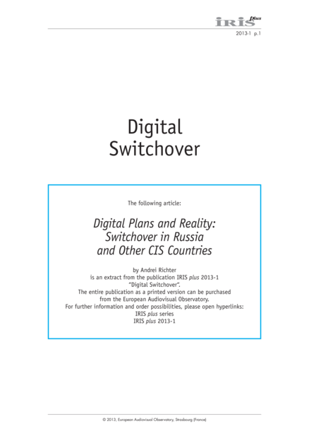 "The advent of digital television has accelerated the elaboration of regulation and related processes in the countries of the region. Some countries adopted changes in their broadcasting statutes (Ukraine in 2006; Armenia in 2008 and 2010; Kazakhstan in 2012) or their mass media statute (Russia in 2011). One country laid the foundations for the switchover in a presidential decree (Uzbekistan in 2012), while the rest have opted for governmental ordinances and executive orders. Some changes made in the process go beyond merely adjusting the legal framework to digital technology." (Conclusion)