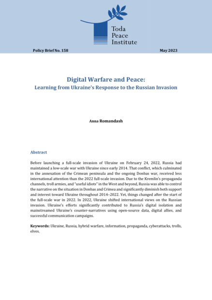 "Before launching a full-scale invasion of Ukraine on February 24, 2022, Russia had maintained a low-scale war with Ukraine since early 2014. That conflict, which culminated in the annexation of the Crimean peninsula and the ongoing Donbas war, received less international attention than the 2022 full-scale invasion. Due to the Kremlin’s propaganda channels, troll armies, and “useful idiots” in the West and beyond, Russia was able to control the narrative on the situation in Donbas and Crimea and significantly diminish both support and interest toward Ukraine throughout 2014–2022. Yet, things changed after the start of the full-scale war in 2022. In 2022, Ukraine shifted international views on the Russian invasion. Ukraine’s efforts significantly contributed to Russia’s digital isolation and mainstreamed Ukraine’s counter-narratives using open-source data, digital allies, and successful communication campaigns." (Abstract)