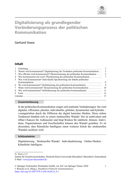 "In der politischen Kommunikation zeigen sich markante Veränderungen: Sie wird digitaler, effizienter, pluraler, individueller, globaler, dynamischer und hybrider – vorangetrieben durch die Diffusion der digital basierten Medien. Diese sieben Tendenzen bündeln sich zu einem strukturellen Wandel. Der ist ambivalent und öffnet Chancen für Außenseiter und birgt Risiken für etablierte Akteure. Individuen, Organisationen und Gesellschaften können den Wandel gestalten. Es ist abzusehen, dass Künstliche Intelligenz einen weiteren Schub des strukturellen Wandels auslösen wird." (Zusammenfassung)