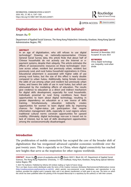 "In an age of digitalization, who still refuses to use digital technology? Drawing on nationally-representative Chinese General Social Survey data, this article finds that about half of Chinese households do not actively use the Internet or epayment systems, despite their ubiquity. This article estimates the effects of socioeconomic resources on these technologies’ (non-)use across urban, resident but previously urban, resident but previously rural, and rural hukou household registrations in China. Educational attainment is associated with higher odds of use among rural hukou, but the size of this effect is nearly double compared to urban hukou. Additionally, being female increases the odds of use among urban and resident but previously urban hukou, and lowers the odds of use in rural hukou, but which are attenuated by the mediating effects of education. The results give credence to education as a direct and indirect mechanism for digital skills development, especially for rural households. Individuals proximal to rural living conditions have fewer opportunities to learn about digital technology, resulting in greater dependency on education as a rare source of skills training. Simultaneously, education indirectly creates opportunities for women to learn digital skills by improving chances for higher-status job participation that require information management skills, especially in rural regions where traditional cultural norms constrain opportunities for upward mobility. Ultimately, digital technology non-use is traced not to lack of interest, but to lack of skills development opportunities among the socioeconomically disadvantaged." (Abstract)