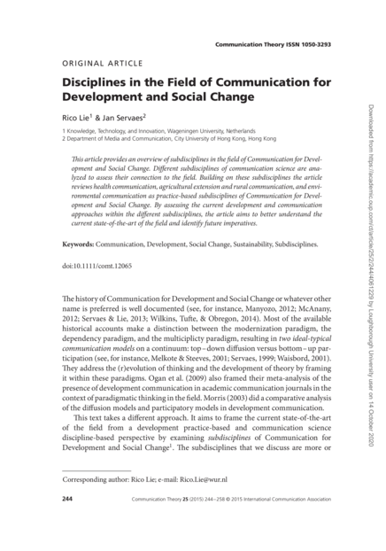"This article provides an overview of subdisciplines in the field of Communication for Development and Social Change. Different subdisciplines of communication science are analyzed to assess their connection to the field. Building on these subdisciplines the article reviews health communication, agricultural extension and rural communication, and environmental communication as practice-based subdisciplines of Communication for Development and Social Change. By assessing the current development and communication approaches within the different subdisciplines, the article aims to better understand the current state-of-the-art of the field and identify future imperatives." (Abstract)