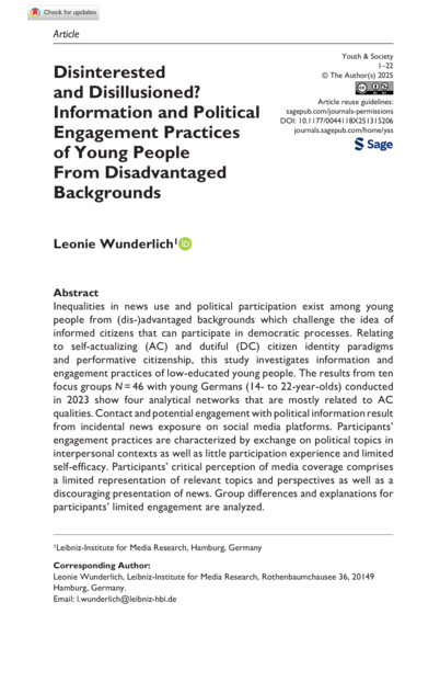 "Inequalities in news use and political participation exist among young people from (dis-)advantaged backgrounds which challenge the idea of informed citizens that can participate in democratic processes. Relating to self-actualizing (AC) and dutiful (DC) citizen identity paradigms and performative citizenship, this study investigates information and engagement practices of low-educated young people. The results from ten focus groups N = 46 with young Germans (14- to 22-year-olds) conducted in 2023 show four analytical networks that are mostly related to AC qualities. Contact and potential engagement with political information result from incidental news exposure on social media platforms. Participants’engagement practices are characterized by exchange on political topics in interpersonal contexts as well as little participation experience and limited self-efficacy. Participants’ critical perception of media coverage comprises a limited representation of relevant topics and perspectives as well as a discouraging presentation of news. Group differences and explanations for participants’ limited engagement are analyzed." (Abstract)