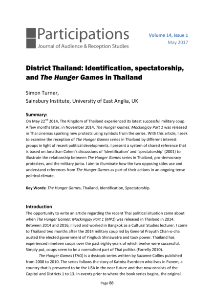 "On May 22nd 2014, The Kingdom of Thailand experienced its latest successful military coup. A few months later, in November 2014, The Hunger Games: Mockingjay Part 1 was released in Thai cinemas sparking new protests using symbols from the series. With this article, I seek to examine the reception of The Hunger Games series in Thailand by different interest groups in light of recent political developments. I present a system of shared reference that is based on Jonathan Cohen’s discussions of ‘identification’ and ‘spectatorship’ (2001) to illustrate the relationship between The Hunger Games series in Thailand, pro-democracy protesters, and the military junta. I aim to illuminate how the two opposing sides use and understand references from The Hunger Games as part of their actions in an ongoing tense political climate." (Summary)
