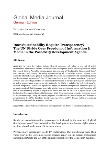 "The inclusion of a clear commitment to access to information in the SDGs [Sustainable Development Goals] – including factual “indicators” to monitor compliance – could have a profound impact on freedom of expression and media globally, advocates contend. Yet it remains uncertain whether any provision on access to information will survive the remaining months of negotiations before the final set of SDGs is agreed at the UN’s Sustainable Development Summit in September 2015. Some developing countries oppose an access to information target, along with other proposed commitments to human rights and democratic governance in the SDGs. But others are strongly supportive, and UN debates on the new goals are likely to continue until the September deadline." (Abstract)