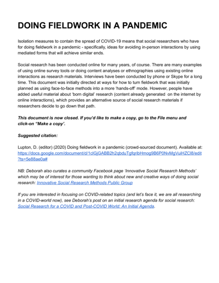 "This document was initially directed at ways for how to turn fieldwork that was initially planned as using face-to-face methods into a more ‘hands-off’ mode. However, people have added useful material about ‘born digital’ research (content already generated on the internet by online interactions), which provides an alternative source of social research materials if researchers decide to go down that path." (Page 1)