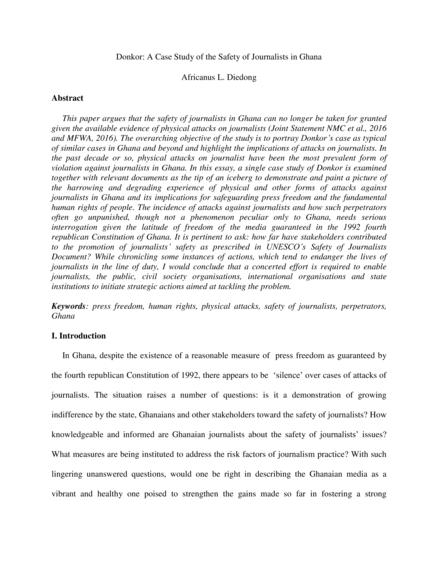 "This paper argues that the safety of journalists in Ghana can no longer be taken for granted given the available evidence of physical attacks on journalists (Joint Statement NMC et al., 2016 and MFWA, 2016). The overarching objective of the study is to portray Donkor’s case as typical of similar cases in Ghana and beyond and highlight the implications of attacks on journalists. In the past decade or so, physical attacks on journalist have been the most prevalent form of violation against journalists in Ghana. In this essay, a single case study of Donkor is examined together with relevant documents as the tip of an iceberg to demonstrate and paint a picture of the harrowing and degrading experience of physical and other forms of attacks against journalists in Ghana and its implications for safeguarding press freedom and the fundamental human rights of people. The incidence of attacks against journalists and how such perpetrators often go unpunished, though not a phenomenon peculiar only to Ghana, needs serious interrogation given the latitude of freedom of the media guaranteed in the 1992 fourth republican Constitution of Ghana. It is pertinent to ask: how far have stakeholders contributed to the promotion of journalists’ safety as prescribed in UNESCO’s Safety of Journalists Document? While chronicling some instances of actions, which tend to endanger the lives of journalists in the line of duty, I would conclude that a concerted effort is required to enable journalists, the public, civil society organisations, international organisations and state institutions to initiate strategic actions aimed at tackling the problem." (Abstract)