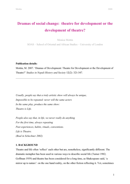 "This paper provides an ethnograpic analysis of the relationship between theatre groups and donors/theatre groups and audiences that moves away from the national planning / social engineering vs domination/resistance frameworks to highlight what happens at the interface of the development encounter. It also considers the impact of foreign funding on Nepali theatre at large. The issues that I raise refer to urban professional / semi-professional actor's representations and experiences of doing social theatre." (Abstract)