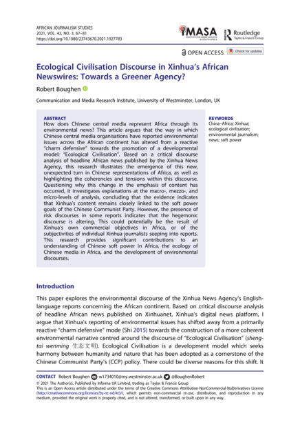 "How does Chinese central media represent Africa through its environmental news? This article argues that the way in which Chinese central media organisations have reported environmental issues across the African continent has altered from a reactive “charm defensive” towards the promotion of a developmental model: “Ecological Civilisation”. Based on a critical discourse analysis of headline African news published by the Xinhua News Agency, this research illustrates the emergence of this new, unexpected turn in Chinese representations of Africa, as well as highlighting the coherencies and tensions within this discourse. Questioning why this change in the emphasis of content has occurred, it investigates explanations at the macro-, mezzo-, and micro-levels of analysis, concluding that the evidence indicates that Xinhua’s content remains closely linked to the soft power goals of the Chinese Communist Party. However, the presence of risk discourses in some reports indicates that the hegemonic discourse is altering. This could potentially be the result of Xinhua’s own commercial objectives in Africa, or of the subjectivities of individual Xinhua journalists seeping into reports." (Abstract)