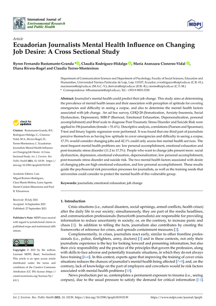 "Journalist's mental health could predict their job change. This study aims at determining the prevalence of mental health issues and their association with perception of aptitude for covering emergencies and difficulty in seeing a corpse, and also to determine the mental health factors associated with job change. An ad hoc survey, GHQ-28 (Somatization, Anxiety-Insomnia, Social Dysfunction, Depression), MBI-P (Burnout, Emotional Exhaustion, Depersonalization, personal accomplishment) and Brief scale to diagnose Post-Traumatic Stress Disorder and Suicide Risk were applied to 196 journalists (female = 51.6%). Descriptive analysis, correlations (Pearson and Spearman), T-test and binary logistic regression were performed. It was found that one third part of journalists perceive themselves as having low aptitude to cover emergencies and difficulty in seeing a corpse, 17.3% would consider changing jobs and 42.1% could only access free mental health services. The most frequent mental health problems are: low personal accomplishment, emotional exhaustion and post-traumatic stress disorder (11.2 to 17.3%). People who want to change jobs present more: social dysfunction, depression, emotional exhaustion, depersonalization, low personal accomplishment, post-traumatic stress disorder and suicide risk. The two mental health factors associated with desire of changing jobs are high emotional exhaustion, and low personal accomplishment. These results guide the psychosocial risk prevention processes for journalists, as well as the training needs that universities could consider to protect the mental health of this vulnerable group." (Abstract)