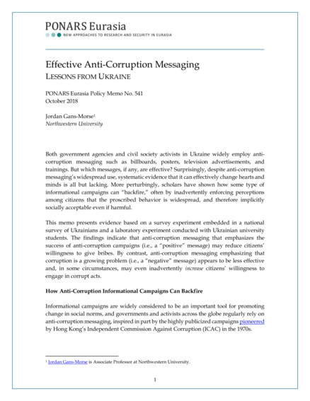 "This memo presents evidence based on a survey experiment embedded in a national survey of Ukrainians and a laboratory experiment conducted with Ukrainian university students. The findings indicate that anti-Corruption messaging that emphasizes the success of anti-Corruption campaigns (i.e., a “positive” message) may reduce citizens’ willingness to give bribes. By contrast, anti-Corruption messaging emphasizing that corruption is a growing problem (i.e., a “negative” message) appears to be less effective and, in some circumstances, may even inadvertently increase citizens’ willingness to engage in corrupt acts." (Page 1)