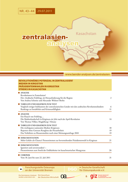 "Die Freiheit der Arbeit von Journalisten ist immer auch ein wichtiger Indikator für den Grad der Demokratisierung eines Staates. Kirgistan ist diesbezüglich ein zerrissenes Land, welches sich zwischen Fortschritten und Rückfällen hin und her bewegt und auch in dieser Hinsicht stark von den Nachwirkungen der Unruhen in Osch im Juni 2010 gekennzeichnet ist. Eine wichtige Richtungsentscheidung wird vermutlich die Präsidentschaftswahl im Oktober sein." (Zusammenfassung)