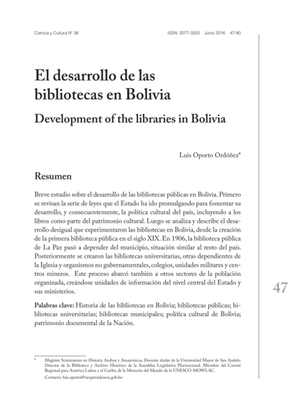 "Breve estudio sobre el desarrollo de las bibliotecas públicas en Bolivia. Primero se revisan la serie de leyes que el Estado ha ido promulgando para fomentar su desarrollo, y consecuentemente, la política cultural del país, incluyendo a los libros como parte del patrimonio cultural. Luego se analiza y describe el desarrollo desigual que experimentaron las bibliotecas en Bolivia, desde la creación de la primera biblioteca pública en el siglo XIX. En 1906, la biblioteca pública de La Paz pasó a depender del municipio, situación similar al resto del país. Posteriormente se crearon las bibliotecas universitarias, otras dependientes de la Iglesia y organismos no gubernamentales, colegios, unidades militares y centros mineros. Este proceso abarcó también a otros sectores de la población organizada, creándose unidades de información del nivel central del Estado y sus ministerios." (Resumen)