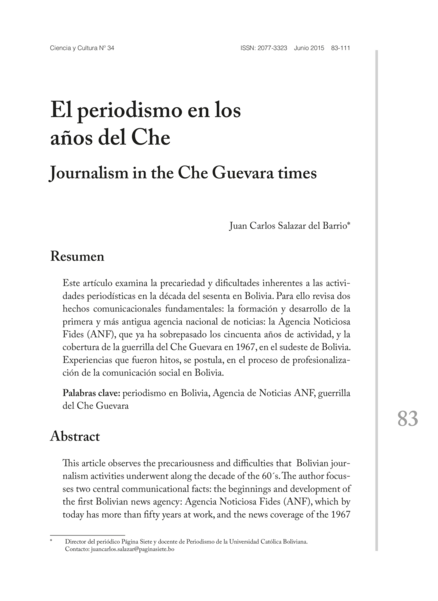 "Este artículo examina la precariedad y dificultades inherentes a las actividades periodísticas en la década del sesenta en Bolivia. Para ello revisa dos hechos comunicacionales fundamentales: la formación y desarrollo de la primera y más antigua agencia nacional de noticias: la Agencia Noticiosa Fides (ANF), que ya ha sobrepasado los cincuenta años de actividad, y la cobertura de la guerrilla del Che Guevara en 1967, en el sudeste de Bolivia. Experiencias que fueron hitos, se postula, en el proceso de profesionalización de la comunicación social en Bolivia." (Resumen)