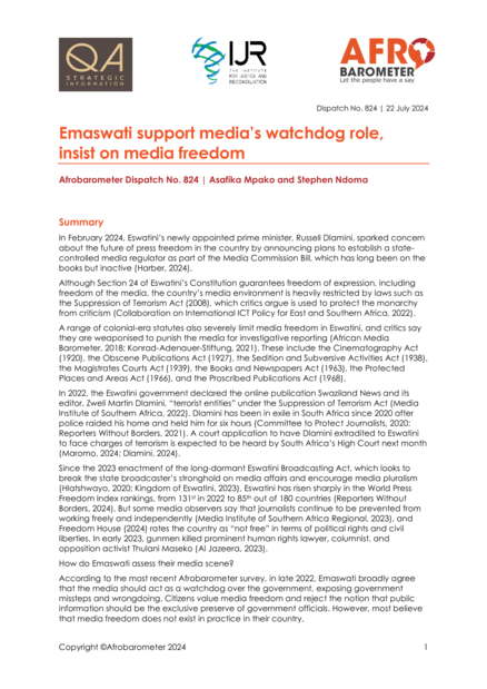 "According to the most recent Afrobarometer survey, in late 2022, Emaswati broadly agree that the media should act as a watchdog over the government, exposing government missteps and wrongdoing. Citizens value media freedom and reject the notion that public information should be the exclusive preserve of government officials. However, most believe that media freedom does not exist in practice in their country. Television and radio are the most popular news sources in Eswatini, but the Internet and social media are favoured, too, especially by youth, urban residents, and more educated citizens." (Summary, pages 1-2)