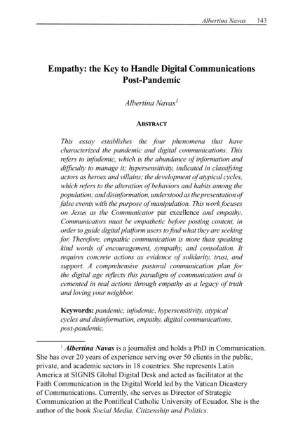 "This essay establishes the four phenomena that have characterized the pandemic and digital communications. This refers to infodemic, which is the abundance of information and difficulty to manage it; hypersensitivity, indicated in classifying actors as heroes and villains; the development of atypical cycles, which refers to the alteration of behaviors and habits among the population; and disinformation, understood as the presentation of false events with the purpose of manipulation. This work focuses on Jesus as the Communicator par excellence and empathy. Communicators must be empathetic before posting content, in order to guide digital platform users to find what they are seeking for. Therefore, empathic communication is more than speaking kind words of encouragement, sympathy, and consolation. It requires concrete actions as evidence of solidarity, trust, and support. A comprehensive pastoral communication plan for the digital age reflects this paradigm of communication and is cemented in real actions through empathy as a legacy of truth and loving your neighbor." (Abstract)