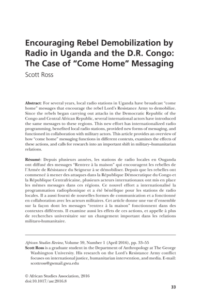 "For several years, local radio stations in Uganda have broadcast “come home” messages that encourage the rebel Lord’s Resistance Army to demobilize. Since the rebels began carrying out attacks in the Democratic Republic of the Congo and Central African Republic, several international actors have introduced the same messages to these regions. This new effort has internationalized radio programming, benefited local radio stations, provided new forms of messaging, and functioned in collaboration with military actors. This article provides an overview of how “come home” messaging functions in different contexts, examines the effects of these actions, and calls for research into an important shift in military–humanitarian relations." (Abstract)