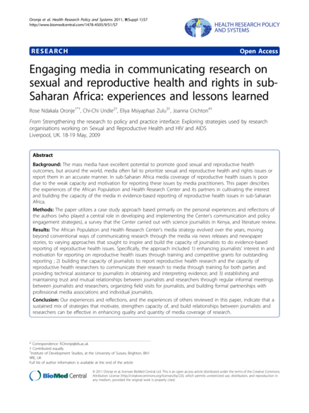 "This paper describes the experiences of the African Population and Health Research Center and its partners in cultivating the interest and building the capacity of the media in evidence-based reporting of reproductive health issues in sub-Saharan Africa [...] The African Population and Health Research Center’s media strategy evolved over the years, moving beyond conventional ways of communicating research through the media via news releases and newspaper stories, to varying approaches that sought to inspire and build the capacity of journalists to do evidence-based reporting of reproductive health issues. Specifically, the approach included 1) enhancing journalists’ interest in and motivation for reporting on reproductive health issues through training and competitive grants for outstanding reporting; 2) building the capacity of journalists to report reproductive health research and the capacity of reproductive health researchers to communicate their research to media through training for both parties and providing technical assistance to journalists in obtaining and interpreting evidence; and 3) establishing and maintaining trust and mutual relationships between journalists and researchers through regular informal meetings between journalists and researchers, organizing field visits for journalists, and building formal partnerships with professional media associations and individual journalists." (Abstract)