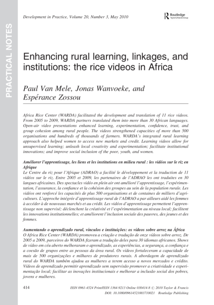 "Africa Rice Center (WARDA) facilitated the development and translation of 11 rice videos. From 2005 to 2009, WARDA partners translated them into more than 30 African languages. Open-air video presentations enhanced learning, experimentation, confidence, trust, and group cohesion among rural people. The videos strengthened capacities of more than 500 organisations and hundreds of thousands of farmers. WARDA's integrated rural learning approach also helped women to access new markets and credit. Learning videos allow for unsupervised learning; unleash local creativity and experimentation; facilitate institutional innovations; and improve social inclusion of the poor, youth, and women." (Abstract)
