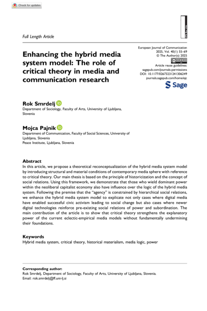 "In this article, we propose a theoretical reconceptualization of the hybrid media system model by introducing structural and material conditions of contemporary media sphere with reference to critical theory. Our main thesis is based on the principle of historicization and the concept of social relations. Using this framework, we demonstrate that those who wield dominant power within the neoliberal capitalist economy also have influence over the logic of the hybrid media system. Following the premise that the “agency” is constrained by hierarchical social relations, we enhance the hybrid media system model to explicate not only cases where digital media have enabled successful civic activism leading to social change but also cases where newer digital technologies reinforce pre-existing social relations of power and subordination. The main contribution of the article is to show that critical theory strengthens the explanatory power of the current eclectic-empirical media models without fundamentally undermining their foundations." (Abstract)