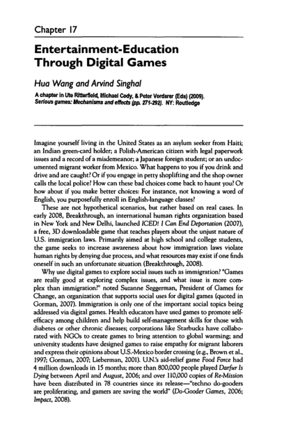 "In summary, the present chapter analyzed the role of digital games in the growing practice of entertainment-education. We argued that serious games should not be automatically labeled as E-E digital games just because they include some social content. Connections were drawn between the social interactional possibilities afforded by the technology of digital games vis-a-vis the more traditional mass-mediated E-E programs, expounding on the five key attributes of experiential game play, multimodality, interactivity, persuasive, interactive narrative, and social interaction. We concluded by noting that digital games offer tremendous generative potential for broaching alternative interventional possibilities for social change, and that scholarship on digital games would benefit from questioning the dominant psychosocial theoretical leanings that privilege linearity, causality, reductionism, and individualcenteredness." (Page 285)