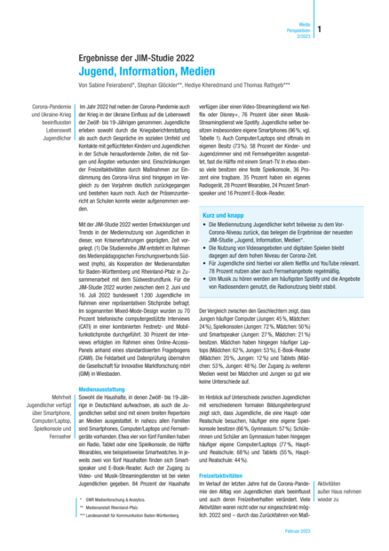 "Die Mediennutzung Jugendlicher kehrt teilweise zu dem Vor- Corona-Niveau zurück, das belegen die Ergebnisse der neuesten JIM-Studie „Jugend, Information, Medien“. Die Nutzung von Videoangeboten und digitalen Spielen bleibt dagegen auf dem hohen Niveau der Corona-Zeit. Für Jugendliche sind hierbei vor allem Netflix und YouTube relevant. 78 Prozent nutzen aber auch Fernsehangebote regelmäßig. Um Musik zu hören werden am häufigsten Spotify und die Angebote von Radiosendern genutzt, die Radionutzung bleibt stabil." (Kurz und knapp, Seite 1)
