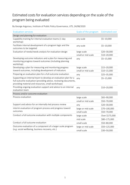 "The resource provides a guide for the expected costs of various evaluative activities in an Australian context. The main purpose for commissioners of evaluative activity to have a sense of the budget they should set aside for these activities. However, the guide also alerts potential users to the range of possible evaluative activities. 'Scale' in the guide refers to a combination of the following interrelated factors: how many people or other units of analysis are the 'target' of the program; whether the project is made up of a variety of sub-programs/projects that are distinct; the geographic spread of the program; the range of key evaluation questions that need to be answered and the range of data collection methods that this implies; whether the evaluative activities will include any 'hard-to-reach' populations; whether the evaluation will involve particular skill-sets, e.g. culturally sensitive evaluation team members." (https://www.betterevaluation.org)