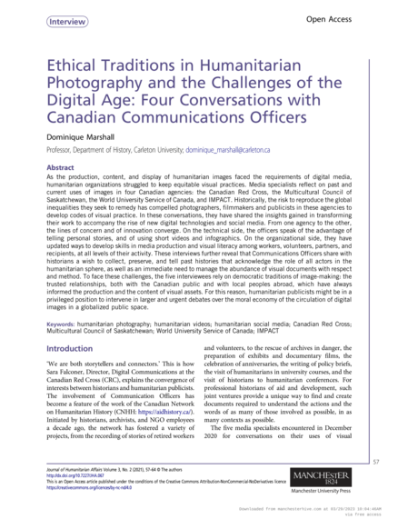 "As the production, content, and display of humanitarian images faced the requirements of digital media, humanitarian organizations struggled to keep equitable visual practices. Media specialists reflect on past and current uses of images in four Canadian agencies: the Canadian Red Cross, the Multicultural Council of Saskatchewan, the World University Service of Canada, and IMPACT. Historically, the risk to reproduce the global inequalities they seek to remedy has compelled photographers, filmmakers and publicists in these agencies to develop codes of visual practice. In these conversations, they have shared the insights gained in transforming their work to accompany the rise of new digital technologies and social media. From one agency to the other, the lines of concern and of innovation converge. On the technical side, the officers speak of the advantage of telling personal stories, and of using short videos and infographics. On the organizational side, they have updated ways to develop skills in media production and visual literacy among workers, volunteers, partners, and recipients, at all levels of their activity. These interviews further reveal that Communications Officers share with historians a wish to collect, preserve, and tell past histories that acknowledge the role of all actors in the humanitarian sphere, as well as an immediate need to manage the abundance of visual documents with respect and method. To face these challenges, the five interviewees rely on democratic traditions of image-making: the trusted relationships, both with the Canadian public and with local peoples abroad, which have always informed the production and the content of visual assets. For this reason, humanitarian publicists might be in a privileged position to intervene in larger and urgent debates over the moral economy of the circulation of digital images in a globalized public space." (Abstract)