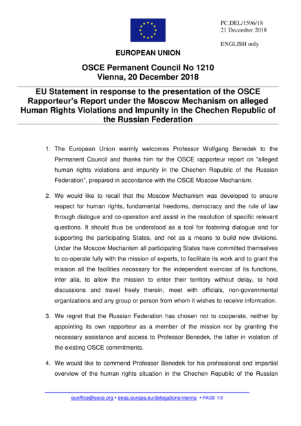 EU Statement in response to the presentation of the OSCE Rapporteur’s Report under the Moscow Mechanism on alleged Human Rights Violations and Impunity in the Chechen Republic of the Russian Federation