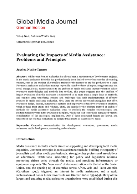 "This paper suggests that the problem of impact evaluation of media assistance is understood to be more than a simple issue of methods, and outlines three underlying tensions and challenges that stifle implementation of effective practices in media assistance evaluation. First, there are serious conceptual ambiguities that affect evaluation design. Second, bureaucratic systems and imperatives often drive evaluation practices, which reduces their utility and richness. Third, the search for the ultimate method or toolkit of methods for media assistance evaluation tends to overlook the complex epistemological and political undercurrents in the evaluation discipline, which can lead to methods being used without consideration of the ontological implications. Only if these contextual factors are known and understood can effective evaluations be designed that meets all stakeholders’ needs." (Abstract)