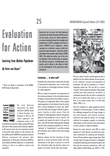 "During the last six years, the Asociación Latinoamericana de Educación Radiofónica (ALER) carried out two main investigations on popular radio in Latin America: on the one hand an external evaluation (in 1996/97) of the strengths and weaknesses of ALER's strategies and lines of action, and on the other hand (in 2000/2001) a diagnosis of the impact of the associate members. The author, one of the two coordinators of the second study, compares the different objectives, methodologies and results of the two experiences. The two studies met their main objectives. The 1996 evaluation led to the implementation or correction of some aspects of the institutional logic, while the 2000 diagnosis led to a broad process of reflection." (Summary)