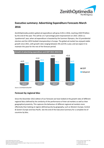 "ZenithOptimedia predicts global ad expenditure will grow 4.6% in 2016, reaching US$579 billion by the end of the year. This will be a 0.7 percentage point improvement on 2015: 2016 is a ‘quadrennial’ year, when ad expenditure is boosted by the Summer Olympics, the US presidential election and the UEFA football championship in Europe. The global ad market has enjoyed stable growth since 2011, with growth rates ranging between 4% and 5% a year, and we expect it to maintain this pace for the rest of the forecast period." (Page 1)