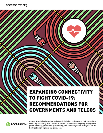 "Both international and domestic laws recognize that extraordinary circumstances require extraordinary measures. The COVID-19 pandemic is such an extraordinary circumstance, and it requires that telecommunications companies (“telcos”) and governments take extraordinary measures to ensure that people are not cut off from internet or phone service, often their lifeline to vital resources. To keep people safe and healthy in the context of physical distancing and lockdown measures, governments and telcos must work together to provide everyone, and especially women, girls, and others in under-represented and at-risk communities, access to an affordable, open, secure, stable, and high-speed internet. As COVID-19 continues to spread, governments and telcos around the world are taking a variety of approaches to internet connectivity, some beneficial and some harmful to human rights and public health. Below, we discuss some of these approaches and provide recommendations to help decision-makers increase connectivity and save lives." (Executive summary)