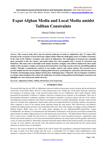 "This research study delves into the intricate landscape of media in Afghanistan after 15 August 2021, focusing on the coexistence of local and Expat Afghan Media within the challenging context of Taliban constraints. In the wake of the Taliban's resurgence and control of Afghanistan, The challenging environment has compelled many journalists to flee the country, and media outlets have been grappled with a myriad of restrictions and limitations. This study seeks to shed light on the unique dynamics, struggles, and resilience displayed by these media entities as they navigate a complex environment characterized by censorship, security concerns, and shifting political realities. Through a comprehensive analysis of case studies, reports, and content analysis, this research aims to provide insights into the role of media in shaping public discourse, promoting free expression, and fostering a sense of identity and belonging among Afghans during these challenging times. Ultimately, this investigation contributes to a deeper understanding of the critical role media plays in societies facing political and ideological constraints and highlights the voices that persist amidst adversity." (Abstract)