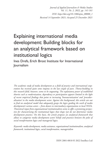 "The academic study of media development as a field of practice and international cooperation has received quite some impetus in the last couple of years. Theory-building in this research field, however, seems to be stagnating. The explanatory power of established theories such as modernization, dependency or participation appears limited in the light of recent empirical findings that point to increasing ‘bureaucratization’ and ‘proceduralization’ in the media development sector. Against this background, this article sets out to find an analytical model that adequately grasps the logics guiding the work of media development’s various actors – from donors to intermediary organizations to local NGOs. Theoretical input from organizational institutionalism seems to offer a promising perspective for characterizing the institutional logics that shape (yet do not determine) media development practice. On this basis, the article proposes an analytical framework that allows to categorize media development actors’ beliefs and practices between the poles of social transformation logics and managerial logics." (Abstract)