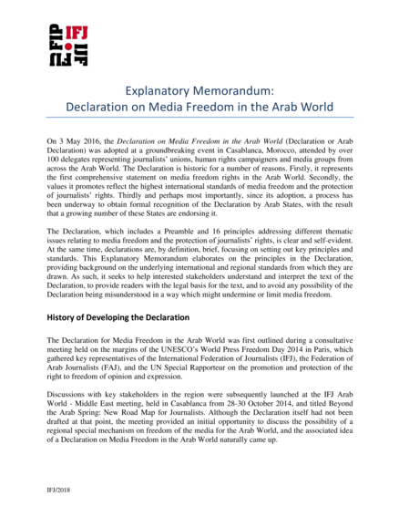 "On 3 May 2016, the Declaration on Media Freedom in the Arab World (Declaration or Arab Declaration) was adopted at a groundbreaking event in Casablanca, Morocco, attended by over 100 delegates representing journalists’ unions, human rights campaigners and media groups from across the Arab World. The Declaration is historic for a number of reasons. Firstly, it represents the first comprehensive statement on media freedom rights in the Arab World. Secondly, the values it promotes reflect the highest international standards of media freedom and the protection of journalists’ rights. Thirdly and perhaps most importantly, since its adoption, a process has been underway to obtain formal recognition of the Declaration by Arab States, with the result that a growing number of these States are endorsing it. The Declaration, which includes a Preamble and 16 principles addressing different thematic issues relating to media freedom and the protection of journalists’ rights, is clear and self-evident. At the same time, declarations are, by definition, brief, focusing on setting out key principles and standards. This Explanatory Memorandum elaborates on the principles in the Declaration, providing background on the underlying international and regional standards from which they are drawn." (Page 1)