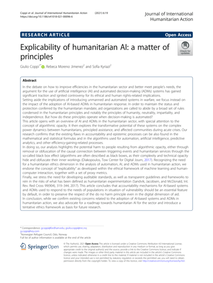 "In the debate on how to improve efficiencies in the humanitarian sector and better meet people’s needs, the argument for the use of artificial intelligence (AI) and automated decision-making (ADMs) systems has gained significant traction and ignited controversy for its ethical and human rights-related implications. Setting aside the implications of introducing unmanned and automated systems in warfare, we focus instead on the impact of the adoption of AI-based ADMs in humanitarian response. In order to maintain the status and protection conferred by the humanitarian mandate, aid organizations are called to abide by a broad set of rules condensed in the humanitarian principles and notably the principles of humanity, neutrality, impartiality, and independence. But how do these principles operate when decision-making is automated? This article opens with an overview of AI and ADMs in the humanitarian sector, with special attention to the concept of algorithmic opacity. It then explores the transformative potential of these systems on the complex power dynamics between humanitarians,principled assistance, and affected communities during acute crises. Our research confirms that the existing flaws in accountability and epistemic processes can be also found in the mathematical and statistical formulas and in the algorithms used for automation, artificial intelligence, predictive analytics, and other efficiency-gaining-related processes. In doing so, our analysis highlights the potential harm to people resulting from algorithmic opacity, either through removal or obfuscation of the causal connection between triggering events and humanitarian services through the so-called black box effect (algorithms are often described as black boxes, as their complexity and technical opacity hide and obfuscate their inner workings (Diakopoulos, Tow Center for Digital Journ, 2017). Recognizing the need for a humanitarian ethics dimension in the analysis of automation, AI, and ADMs used in humanitarian action, we endorse the concept of “explicability” as developed within the ethical framework of machine learning and humancomputer interaction, together with a set of proxy metrics. Finally, we stress the need for developing auditable standards, as well as transparent guidelines and frameworks to rein in the risks of what has been defined as humanitarian experimentation (Sandvik, Jacobsen, and McDonald, Int. Rev. Red Cross 99(904), 319–344, 2017). This article concludes that accountability mechanisms for AI-based systems and ADMs used to respond to the needs of populations in situation of vulnerability should be an essential feature by default, in order to preserve the respect of the do no harm principle even in the digital dimension of aid. In conclusion, while we confirm existing concerns related to the adoption of AI-based systems and ADMs in humanitarian action, we also advocate for a roadmap towards humanitarian AI for the sector and introduce a tentative ethics framework as basis for future research." (Abstract)