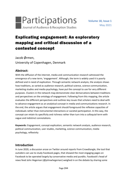 "With the diffusion of the internet, media and communication research witnessed the emergence of a new term, ‘engagement’. Although, the term is widely used it is poorly defined and in need of explication. Through semantic network analysis, the analysis shows how traditions, as varied as audience research, political science, science communication, marketing studies and media psychology, have put the concept to use for very different purposes. Clusters in the network map demonstrate clear demarcations between traditions and perspectives on the ontology of engagement. Following from this mapping, the article evaluates the different perspectives and outlines key issues that scholars need to deal with to advance engagement as an analytical concept in media and communications research. In the end, the article argues that engagement should foreground the reflexive capacities of individuals rather than instrumental interactions or societal participation. In this way, the concept can retain its specificity and richness rather than turn into a colloquial term with vague and indistinct connotations." (Abstract