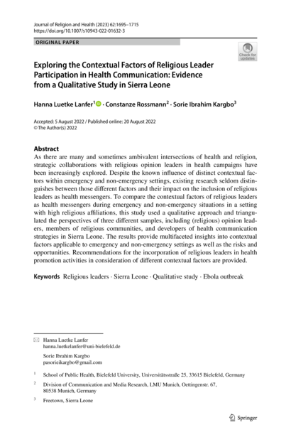 "As there are many and sometimes ambivalent intersections of health and religion, strategic collaborations with religious opinion leaders in health campaigns have been increasingly explored. Despite the known influence of distinct contextual factors within emergency and non-emergency settings, existing research seldom distinguishes between those different factors and their impact on the inclusion of religious leaders as health messengers. To compare the contextual factors of religious leaders as health messengers during emergency and non-emergency situations in a setting with high religious affiliations, this study used a qualitative approach and triangulated the perspectives of three different samples, including (religious) opinion leaders, members of religious communities, and developers of health communication strategies in Sierra Leone. The results provide multifaceted insights into contextual factors applicable to emergency and non-emergency settings as well as the risks and opportunities. Recommendations for the incorporation of religious leaders in health promotion activities in consideration of different contextual factors are provided." (Abstract)