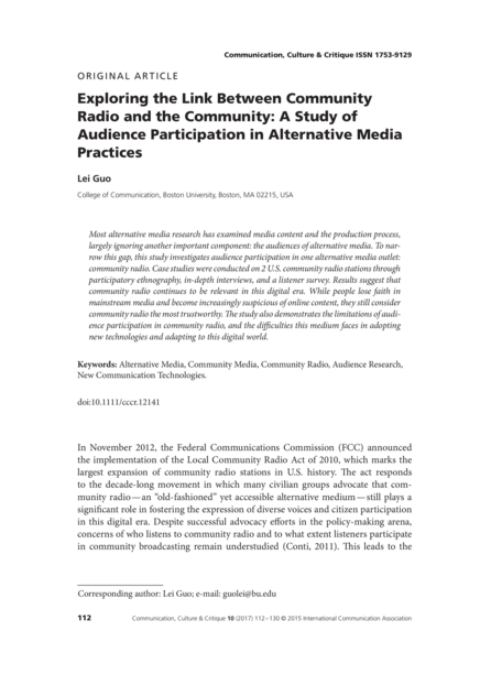 "Most alternative media research has examined media content and the production process, largely ignoring another important component: the audiences of alternative media. To narrow this gap, this study investigates audience participation in one alternative media outlet: community radio. Case studies were conducted on 2U.S. community radio stations through participatory ethnography, in-depth interviews, and a listener survey. Results suggest that community radio continues to be relevant in this digital era. While people lose faith in mainstreammedia and become increasingly suspicious of online content, they still consider community radio the most trustworthy.Thestudy also demonstrates the limitations of audience participation in community radio, and the difficulties this medium faces in adopting new technologies and adapting to this digital world." (Abstract)