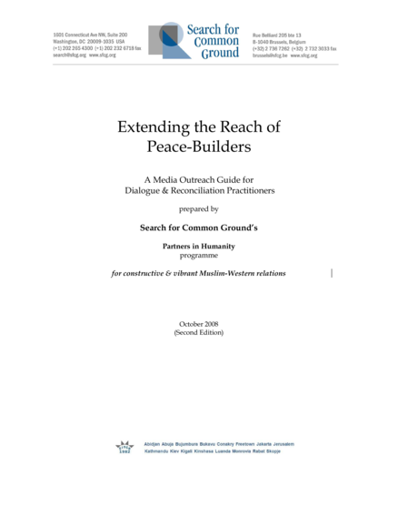 "This guide has been designed to complement Search for Common Ground’s media outreach training workshops for non-governmental organizations, civil society activists and other individuals and groups working in the fields of conflict resolution, dialogue, reconciliation and related human security initiatives, but it can also be used on its own. It has been developed to provide short and easy tips and suggestions for traversing the realm of the media and making yourself heard. It is not a comprehensive guide, but a practical tool for organizations and individuals with little time or money to spend on media outreach but a lot to gain from engaging in it." (Page 2)