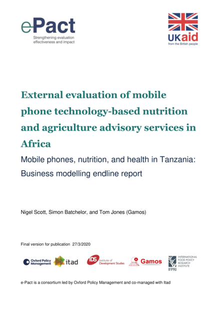 "mNutrition is a global initiative supported by FCDO, managed by GSMA, and implemented by in-country MNOs and third party providers to use mobile technology, that sought to improve the health and nutritional status of children and adults in the developing world. The potential to utilise mobile technology to change attitudes, knowledge, behaviours, and practices around health and agriculture for improved nutritional status has been recognised for some time, but to date there have been no rigorous evaluations of m-services at scale. A consortium of researchers from Gamos, IDS, and IFPRI were contracted to conduct a rigorous mixed-methods evaluation to estimate the impact of mNutrition on children and adults, and to understand how the context and the components of the mNutrition intervention shape its impact. In Tanzania, the service, Wazazi Nipendeni, focused on the provision of nutrition and health information and services to vulnerable pregnant women and caregivers of children under the age of five on their mobile phones, with the goal of improving nutrition outcomes and behaviours for mothers and young children." (https://opendocs.ids.ac.uk)