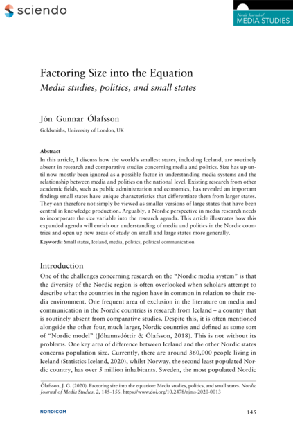 "In this article, I discuss how the world’s smallest states, including Iceland, are routinely absent in research and comparative studies concerning media and politics. Size has up until now mostly been ignored as a possible factor in understanding media systems and the relationship between media and politics on the national level. Existing research from other academic fields, such as public administration and economics, has revealed an important finding: small states have unique characteristics that differentiate them from larger states. They can therefore not simply be viewed as smaller versions of large states that have been central in knowledge production. Arguably, a Nordic perspective in media research needs to incorporate the size variable into the research agenda. This article illustrates how this expanded agenda will enrich our understanding of media and politics in the Nordic countries and open up new areas of study on small and large states more generally." (Abstract)