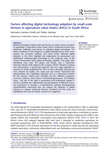 "Digital technologies enable small-scale farmers to reduce some constraints to participate in Agriculture Value Chains (AVCs). Small-scale farmers face significant challenges and barriers to adopting digital technology. This study contributes to the literature on digital development in three ways: present the economic, political, and social factors affecting digital adoption in the AVCs; highlight the implications for governance and institutional challenges;adds knowledge to the analytical value of the Choice Frameworkto study digital technology adoption. This paper after identifying more than 100 papers and articles, uses a Systematic Literature Review (SLR) aligned with Cooper’s [(2010). Research synthesis and meta-analysis: A step-by-step approach (5th ed.). Sage] approach to examine 52 articles published from 2014 to 2019, ultimately selecting the most relevant 36 studies. The study uses the Choice Framework that operationalizes the Capabilities Approach (CA) as a theoretical window for this research. Papers were classified into four different categories: economic; political; social factors; institutional/governance. The findings show: - the role of the state in governance and institutional support is critical to facilitate the collaboration and participation of different actors;-the importance to develop acomprehensive localized developmental implementation framework that can support the adoption of digital solutions to support small-scale farmers. Limitations for this study are highlighted and areas for further research are suggested." (Abstract)