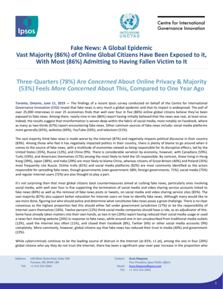"The findings of a recent Ipsos survey conducted on behalf of the Centre for International Governance Innovation (CIGI) reveal that fake news is very much a global epidemic and that its impact is widespread. The poll of over 25,000 interviews in over 25 economies finds that well over four in five (86%) online global citizens believe they’ve been exposed to fake news. Among them, nearly nine in ten (86%) report having initially believed that the news was real, at least once. Indeed, the results suggest that misinformation is woven deep within the fabric of social media, most notably on Facebook, where as many as two-thirds (67%) report encountering fake news. Other common sources of fake news include: social media platforms more generally (65%), websites (60%), YouTube (56%), and television (51%)." (Page 1)